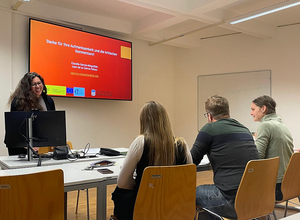 In ihrer Präsentation "Literary Narratives on Climate in the Early Modern Age" gab Claudia García-Minguillán Torres, die derzeit ein Fellowship im fakultären Schwerpunktbereich Transmediterrane Verflechtungen innehat, einen spannenden Einblick in ihr neues Forschungsvorhaben zu Klimaveränderungen und Naturkatastrophen in älteren romanischen Literaturen. Dabei warf sie die ebenso anregende wie provokante Frage auf, ob sich in literarischen Texten konkrete Ansätze für den Umgang mit verheerenden Naturereignissen finden lassen. Im Zentrum ihres Vortrags stand als Fallbeispiel das epische Gedicht La Riada (1784)des spanischen Autors Cándido María Trigueros, das der großen Überschwemmung in Sevilla zum Jahreswechsel 1783/84 gewidmet ist. Dieses historische Krisenereignis und seine literarische Bearbeitung rückte Claudia García-Minguillán Torres in einen suggestiven Vergleichszusammenhang mit der Flutkatastrophe in der mediterranen Küstenstadt Valencia im Herbst 2024 ein. Hiervon ausgehend entspann sich eine sehr lebhafte Diskussion, in der sich das Publikum und die Referentin über - historisch sicherlich wandelbare - Erfahrungs-, Wahrnehmungs- und Darstellungsweisen von Naturkatastrophen in Literatur wie in der realen Lebenswelt austauschten.